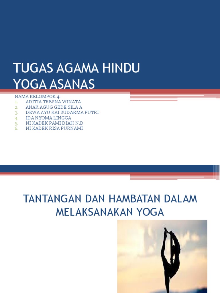 Ajaran yoga bukanlah sebuah ajaran yang menyangkut khusus tentang ajaran agama atau kepercayaan tertentu. Ni Wayan Wiraswastini Ni Wayan Soma Ekasari dan Ni Nengah Heni Hayati ditutup dengan Relaksasi oleh I Wayan Sudarmasv. Pengertian dan Hakikat Yoga menurut Agama Hindu Yoga di samping sebagai pengetahuan rohani juga dapat memberikan latihan-latihan badanasanas.